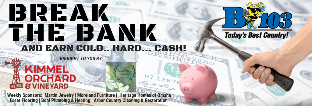 Now, listen and win with Break the Bank – brought to you by First Class Flowers in Nebraska City, Kimmel Orchard and Vineyard in Nebraska City and River Country’s Free Money Station, B103!