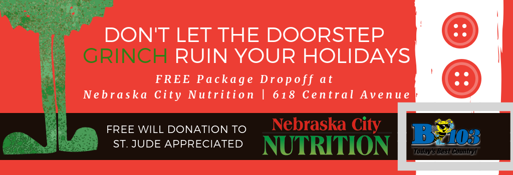 Package theft is more common during the holidays and even more common in rural areas. So, B103 is doing something about it! Don’t let the doorstep Grinch ruin your Christmas. Have your packages delivered to Nebraska City Nutrition at 618 Central Ave. in Nebraska City and pickup at your convenience – all for a free-will donation to St. Jude Children’s Research Hospital.