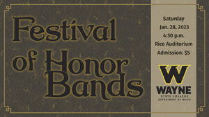 Wayne State College Department of Music hosts the annual Festival of Honor Bands Concert Saturday, January 28 at 4:30 p.m. in Rice Auditorium. The festival cultivates the musical skills of junior high and high school students from Nebraska, Iowa, and South Dakota. Students participate based on audition and spend the day learning from skilled clinicians. Concert admission is $5. For more information, contact the WSC Music Department at (402) 375-7359.