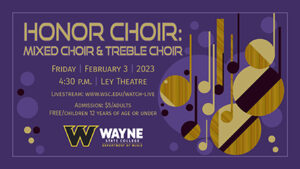 High school students from Nebraska and Iowa perform at the Wayne State College Honor Choir concert on Friday, February 3 at 4:30 p.m. in Ley Theatre. The concert features a treble choir and mixed choir. Admission is $5 for adults with free admission for children 12 years of age or under. The concert will also be livestreamed. To view the livestream, go to www.wsc.edu/watch-live. For more information, contact the WSC Music Department at (402) 375-7359.