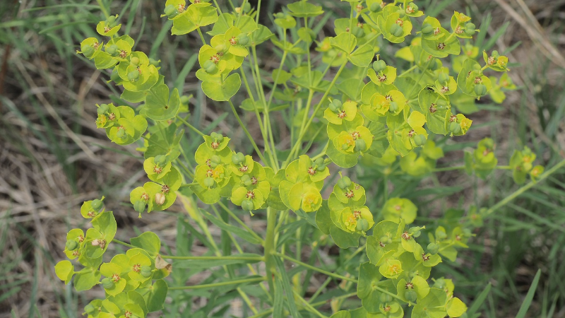 Leafy spurge is a non-native perennial forb. Photo credit Gary Stone.