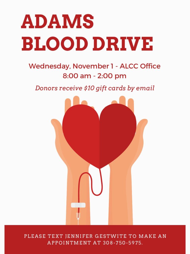 Wednesday, November 1 from 8:00 am to 2:00 pm, Adams Land and Cattle is hosting its 29th annual blood drive at their office in Broken Bow.