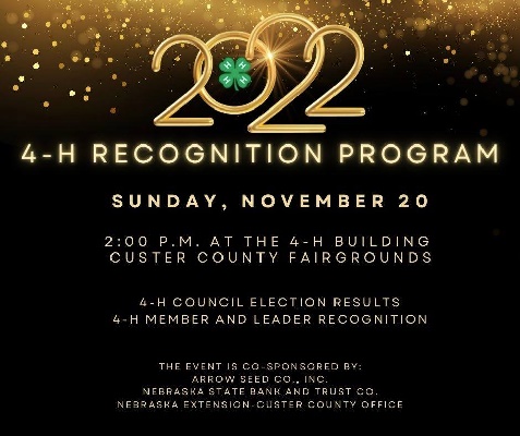 CUSTER COUNTY–The 2022 4-H Recognition program for Custer County will be held Sunday, November 20 at 2 p.m. at the 4-H Building in Broken Bow. Sponsors for the event are Arrow Seed Co., Inc., Nebraska State Bank and Trust Co., and Nebraska Extension in Custer County.