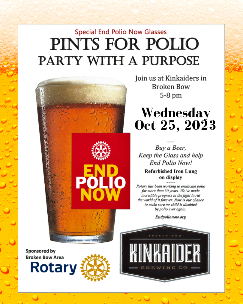Come and “Party with a Purpose” at Kinkaider Brewing Company this Wednesday from 5-8 p.m. with the Broken Bow Area Rotary.