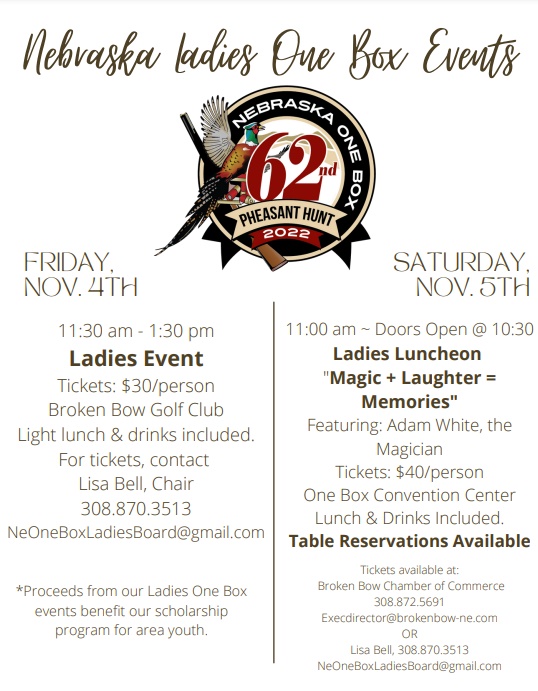 Contact Lisa Bell for tickets at 308-870-3513 or [email protected] or for the Ladies Luncheon, contact Lisa Bell or the Broken Bow Chamber of Commerce at 308-872-5691 or [email protected].
