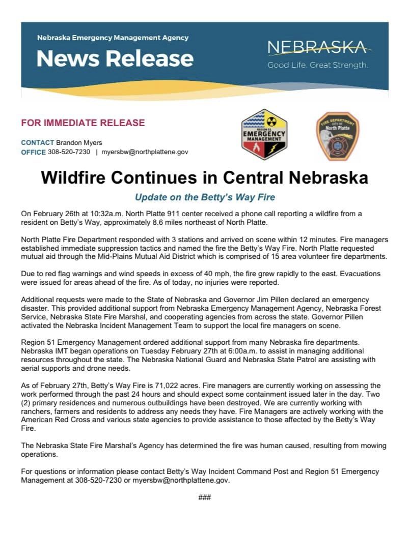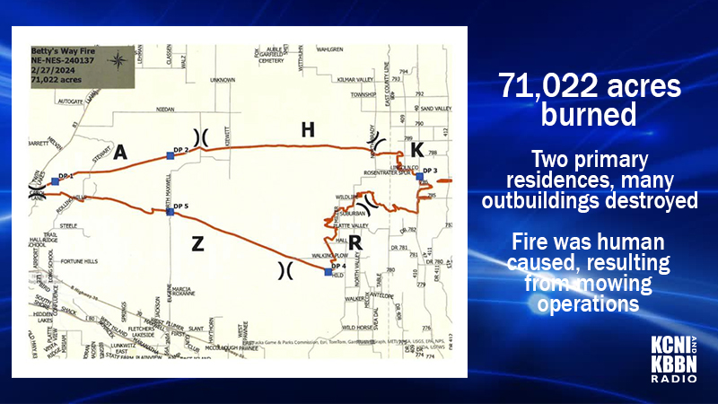 According to the Nebraska Emergency Management Agency (NEMA), the Betty’s Way fire has travelled over 71,022 acres, determined by the Nebraska State Fire Marshal’s Agency to be human caused, resulting from mowing operations.