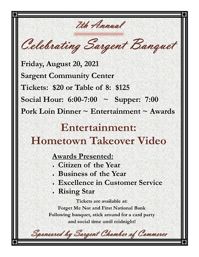 SARGENT–The City of Sargent will celebrate community members and businesses during the 7th annual “Celebrating Sargent Banquet.” The Sargent Chamber of Commerce is sponsoring the banquet to be held on Friday, August 20 at the Sargent Community Center. Tickets are available for $20 each or $125 for a Table of 8.