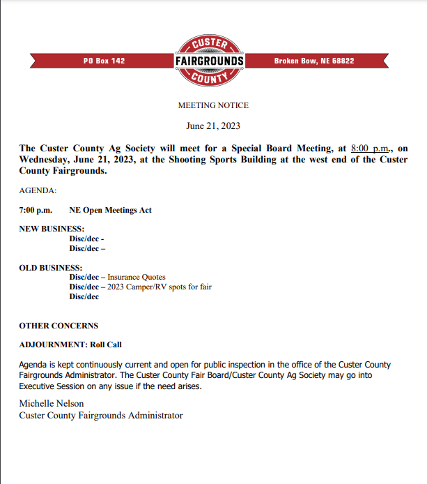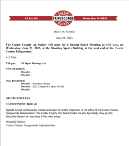 BROKEN BOW – The Custer County Ag Society will be holding a special meeting tomorrow night, June 21, at 8 p.m. at the Shooting Sports Building on the Custer County Fairgrounds.