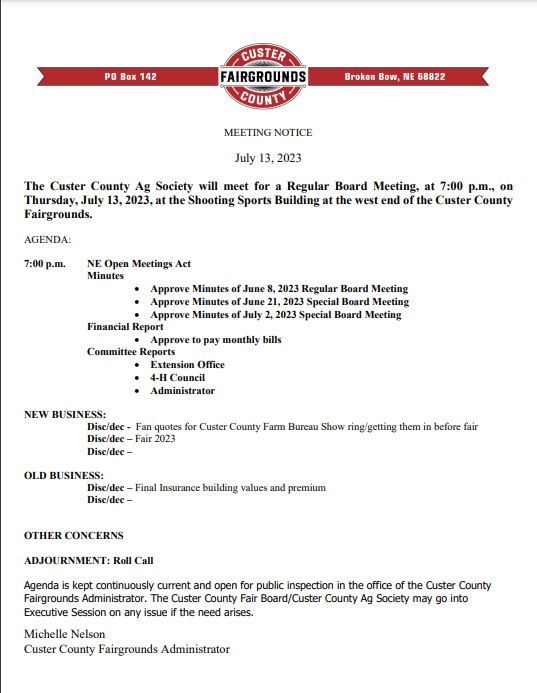 BROKEN BOW – The Custer County Ag Society will hold its regular monthly meeting tomorrow, July 13 at its regular location: the Shooting Sports Building at the west end of the Custer County Fairgrounds.