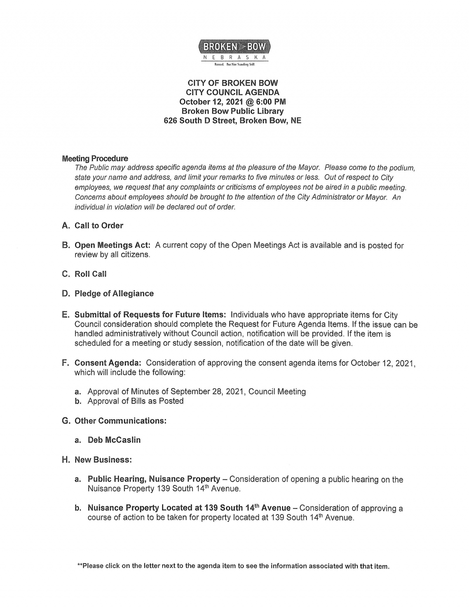 Agenda: City Council To Discuss Nuisance Property, KENO Funds, And More; Meeting At Library