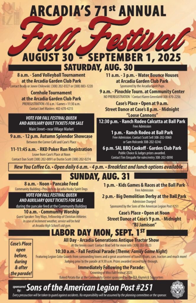 The community of Arcadia is gearing up for the 71st annual Fall Festival, set for Labor Day weekend Saturday through Monday. A full schedule of activities is ahead for all ages.