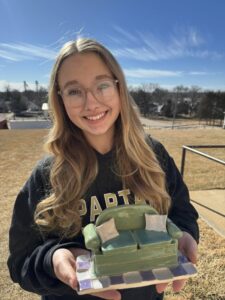 “To me, this piece represents the comfort of home and those small, relatable moments we all have,” said Boyles. “I put a lot of effort into the details of the clay and the specific colors of the glaze, so seeing that blue ribbon felt like all that time in the art room really paid off. Having it recognized at conference during my senior year makes it even more special.”