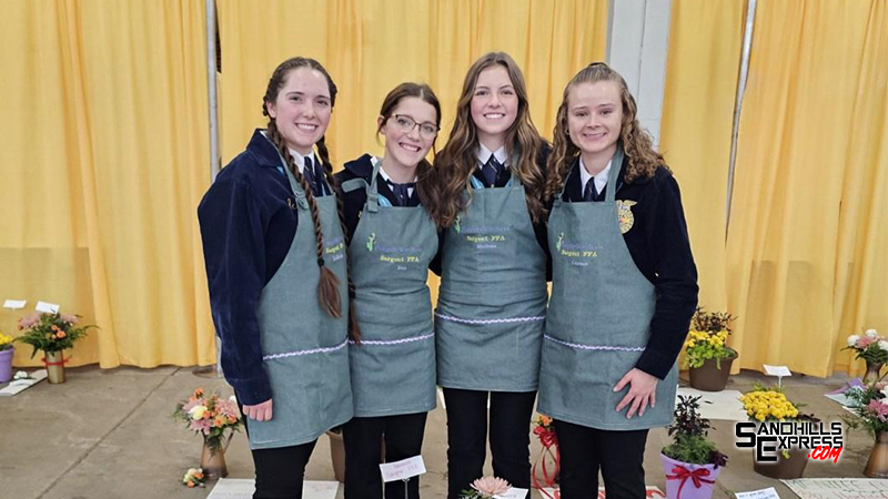 The Sargent Floriculture team, consisting of LoReena Schauda, Melissa Slagle, Carsen Vincent, and Eve Kipp, brought home silver emblem team recognition. The four tested their knowledge and skills in the production and retailing of flowers, plants, and foliage. Competition involved a general knowledge exam on the floriculture industry, identifying plant materials, demonstrating problem solving and decision-making skills, employment and customer service skills, technical floral skills and the ability to work as a team.