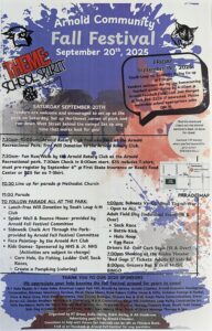 The organizers of the 2025 Arnold Community Fall Festival thank their numerous sponsors. See the flier below with full details. To leave questions about the Fall Festival visit the Arnold Fall Festival Facebook page.