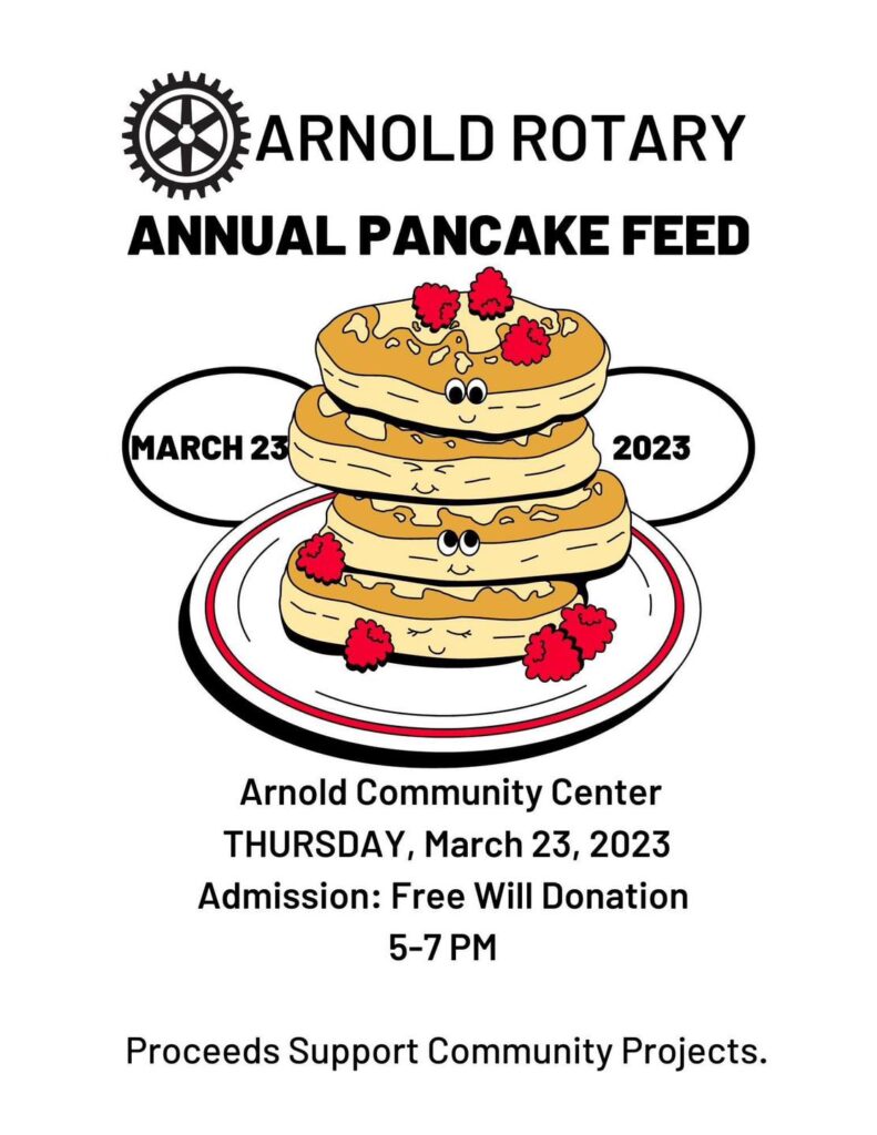 ARNOLD – The Arnold Rotary will be holding its annual pancake feed Thursday evening, March 23, from 5 to 7 p.m. at the Arnold Community Center.