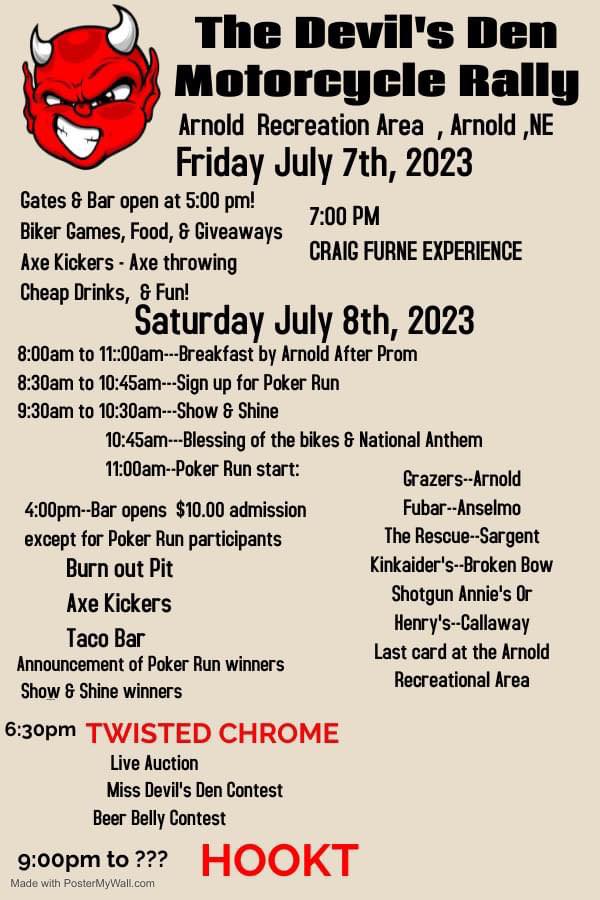 At 6:30 on Saturday, Twisted Chrome will perform, and the rally will hold its live auction and its Miss Devil’s Den and Beer Belly contests. Hookt will take the stage at 9 p.m. A flyer is attached.