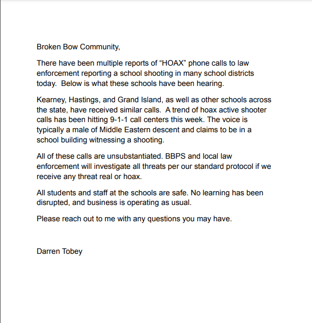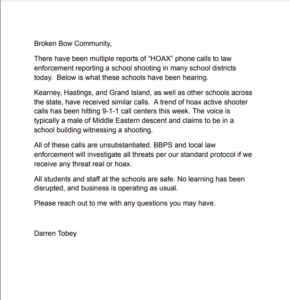 BROKEN BOW – Superintendent Darren Tobey has released a statement to the community of Broken Bow regarding the “swatting” hoaxes on schools across the state.