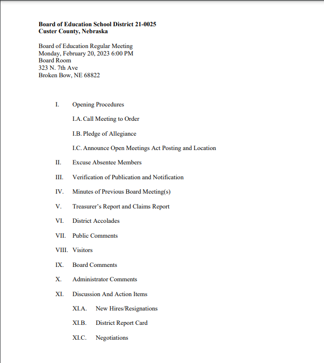 The board will also review, and possibly renew, the 2023-2024 negotiated agreement between the Broken Bow Education Association and the Board of Education of School District 25.