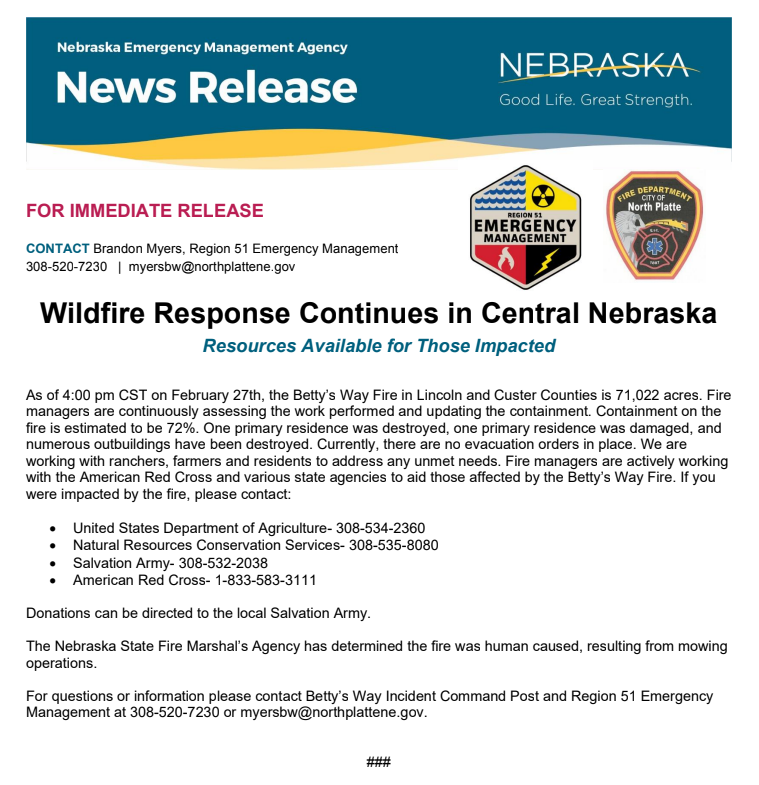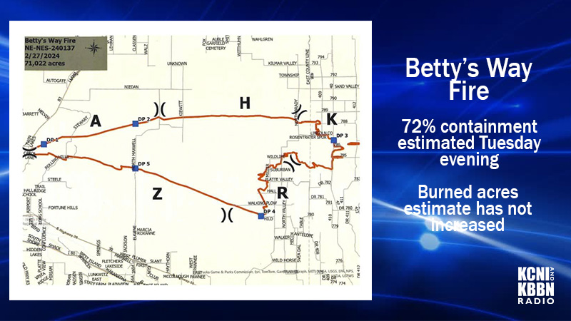 In a press release issued Tuesday evening, the Nebraska Emergency Management Agency (NEMA) stated that containment of the Betty’s Way Fire is estimated to be 72%.