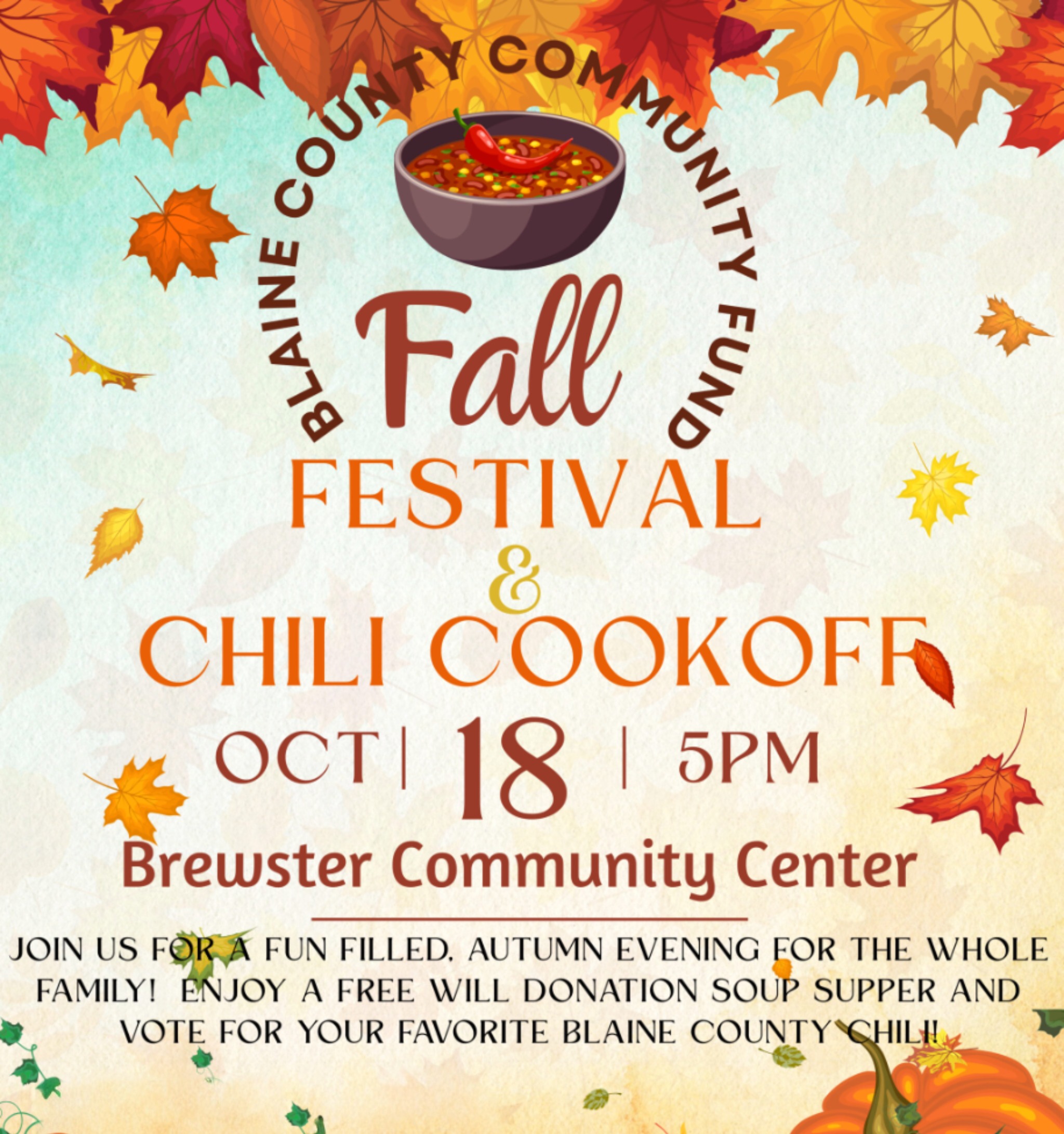 The Blaine County Community Fund (BCCF) invites families and friends to attend their Fall Festival and Chili Cook-off Saturday, October 18 at the Brewster Community Center. The chili will be hot for the free-will donation soup supper at 5:00 PM.