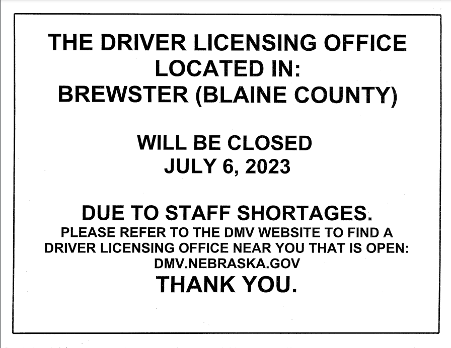 BREWSTER – The Blaine County Clerk’s Office has released a statement informing residents that the Blaine County Driver Licensing Office will be closed today, July 6 due to staffing shortages.