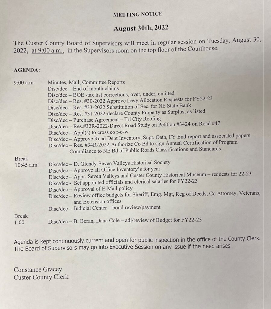 BROKEN BOW – The Custer County Board of Supervisors will meet on Tuesday, August 30 at 9 a.m. on the top floor of the Custer County Courthouse to round out the month.