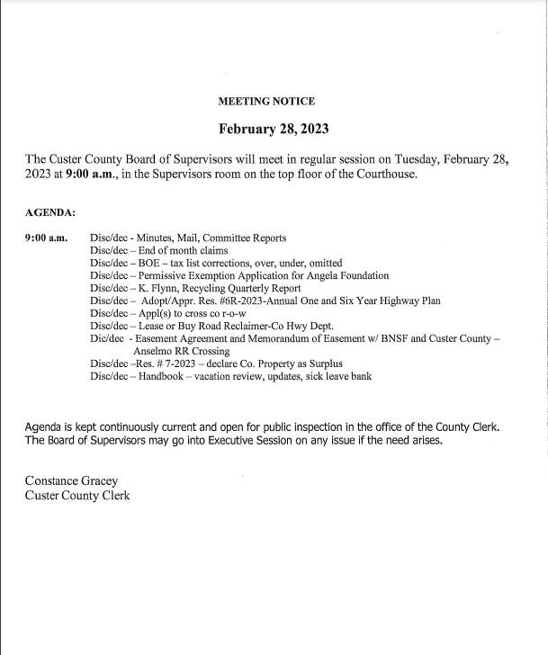 The supervisors will consider the easement agreement and memorandum of easement between BNSF and Custer County regarding the Anselmo railroad crossing, and will hear from the County Highway Department regarding leasing or buying road reclaimer.