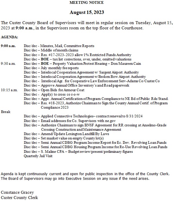 BROKEN BOW- The Custer County Board of Supervisors will meet in regular session on Tuesday, August 15, at 9:00 am in the Supervisors room on the top floor of the Courthouse in Broken Bow. A full agenda can be seen below (click to enlarge):