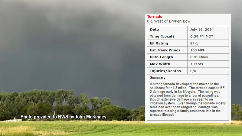 A damage and storm survey has been completed regarding Tuesday evening’s storms in Custer County, according to the National Weather Service (NWS) office in North Platte. A brief tornado on the far western edge of the City of Broken Bow was a part of the report.
