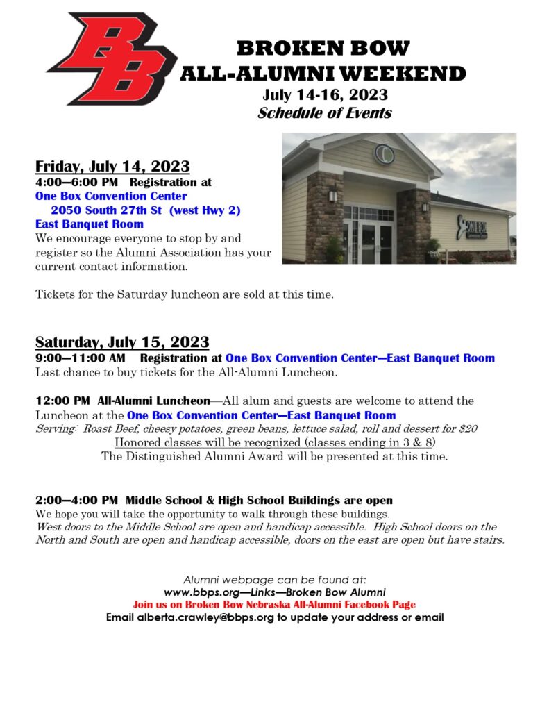 BROKEN BOW – Nothing marks early summer in Broken Bow quite like the annual Alumni Weekend, and right on schedule, the itinerary for the weekend has been released. This year, the celebration will go from Friday, July 14 into Sunday, with the centerpiece lunch on Saturday.