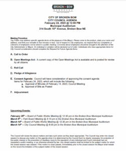 BROKEN BOW – The Broken Bow City Council is scheduled to meet at noon on Friday, February 24 at the Municipal Building Auditorium.
