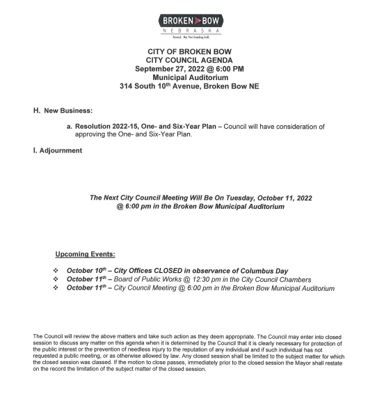 BROKEN BOW – The Broken Bow City Council is set to meet for the first time this fall on Tuesday, September 27 at 6 p.m. in the Municipal Building auditorium. The meeting will mark the first since the budget hearing.
