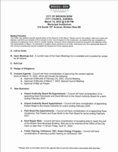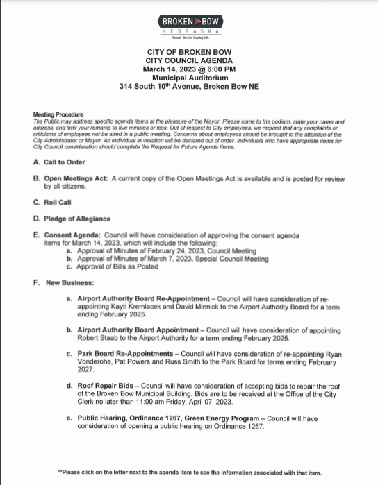 BROKEN BOW – The Broken Bow City Council will hold its mid-month meeting on Tuesday, March 14 at 6 p.m. in the Municipal Building Auditorium.