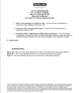 A public hearing will be held regarding Ordinance 1267, which pertains to the Green Energy Program, and would confirm a subscription with the Municipal Energy Agency of Nebraska (MEAN). The council will also have the option of approving that ordinance, and of approving Resolution 2023-1, which would appoint Electric Superintendent Blake Waldow to serve as Director to the MEAN Board of Directors, and City Treasurer Megan Linn as Alternative Director.