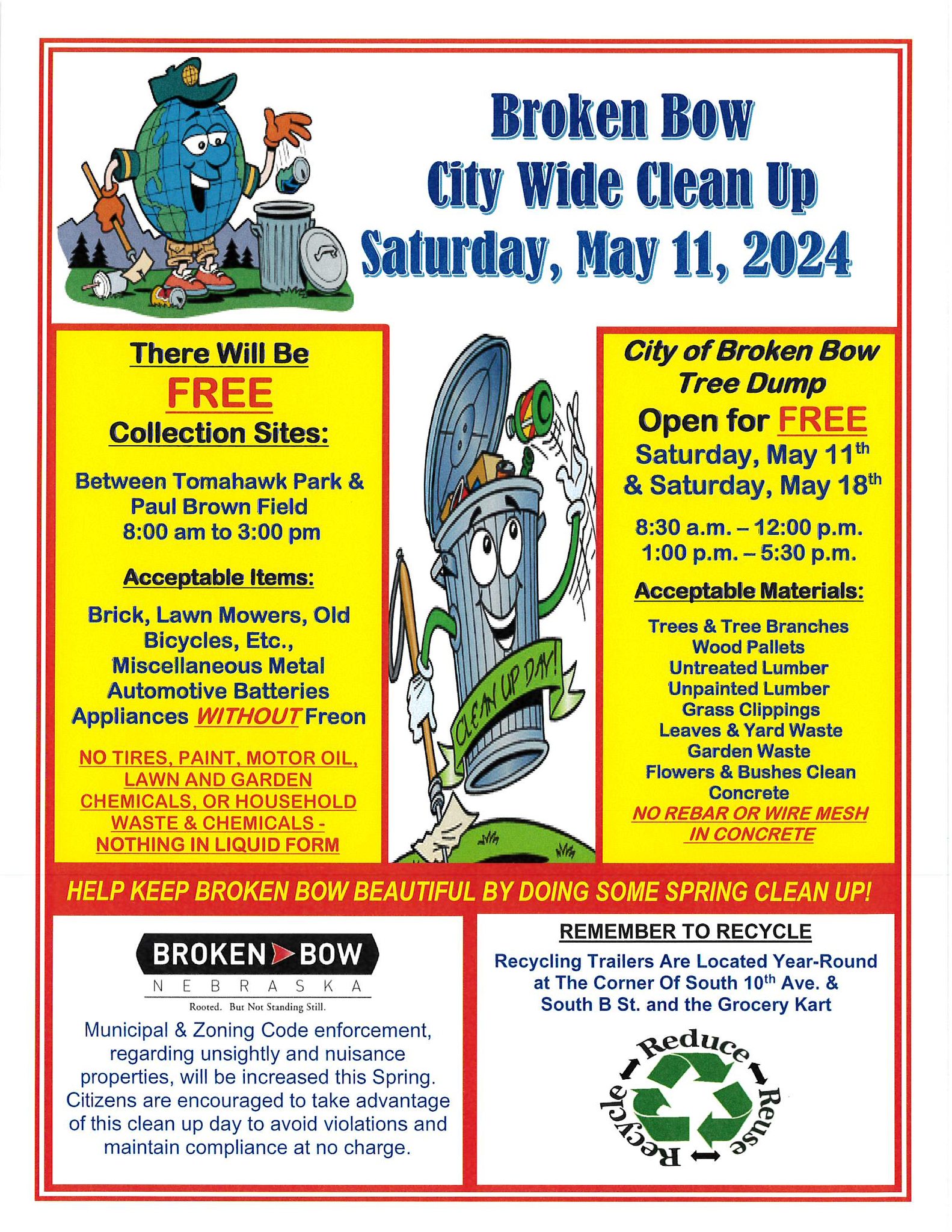 BROKEN BOW, NE – Spring has arrived, and in an effort to help keep Broken Bow beautiful, a city wide clean up is being held Saturday (May 11) with free services available for citizens.