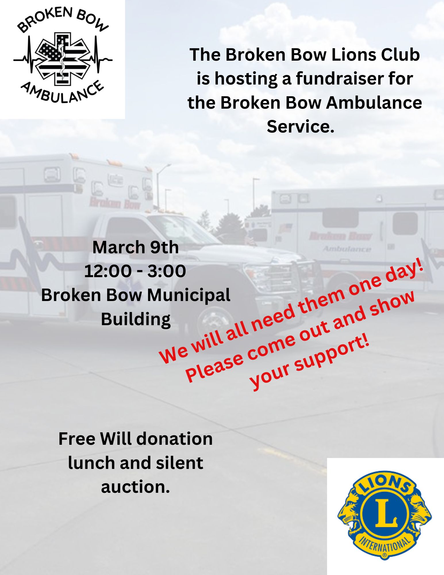Originally announced at the beginning of January, the Broken Bow Lions Club’s fundraiser for the Broken Bow Ambulance Service is approaching this Sunday (March 9). The event’s flyer puts it perfectly: “We will all need them one day!”