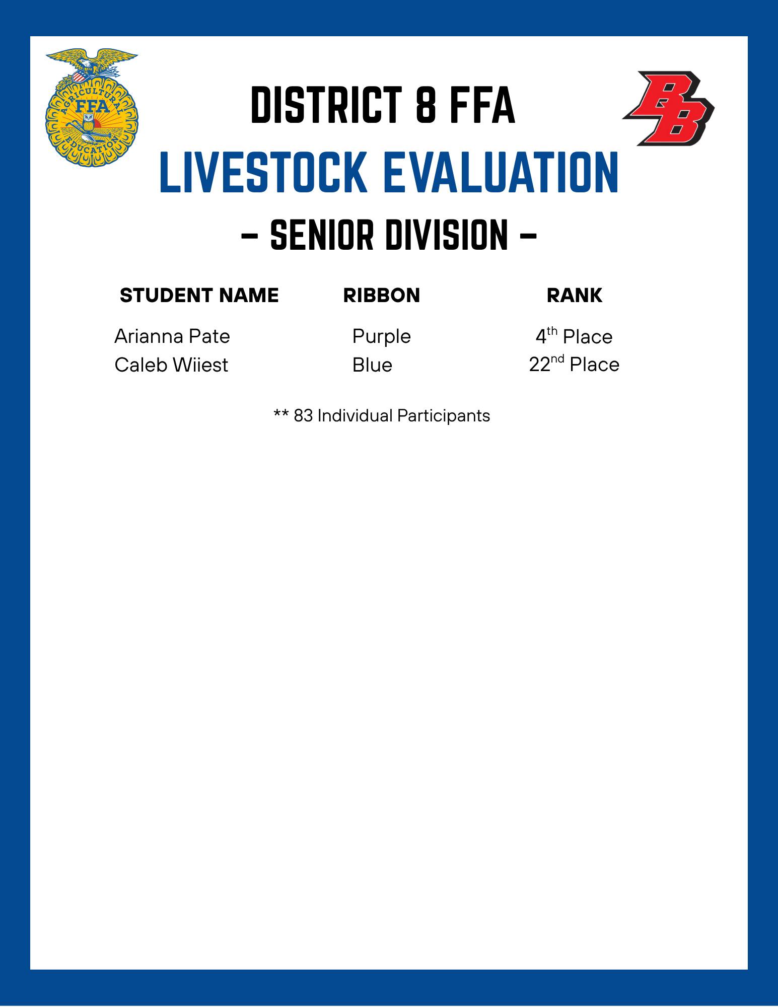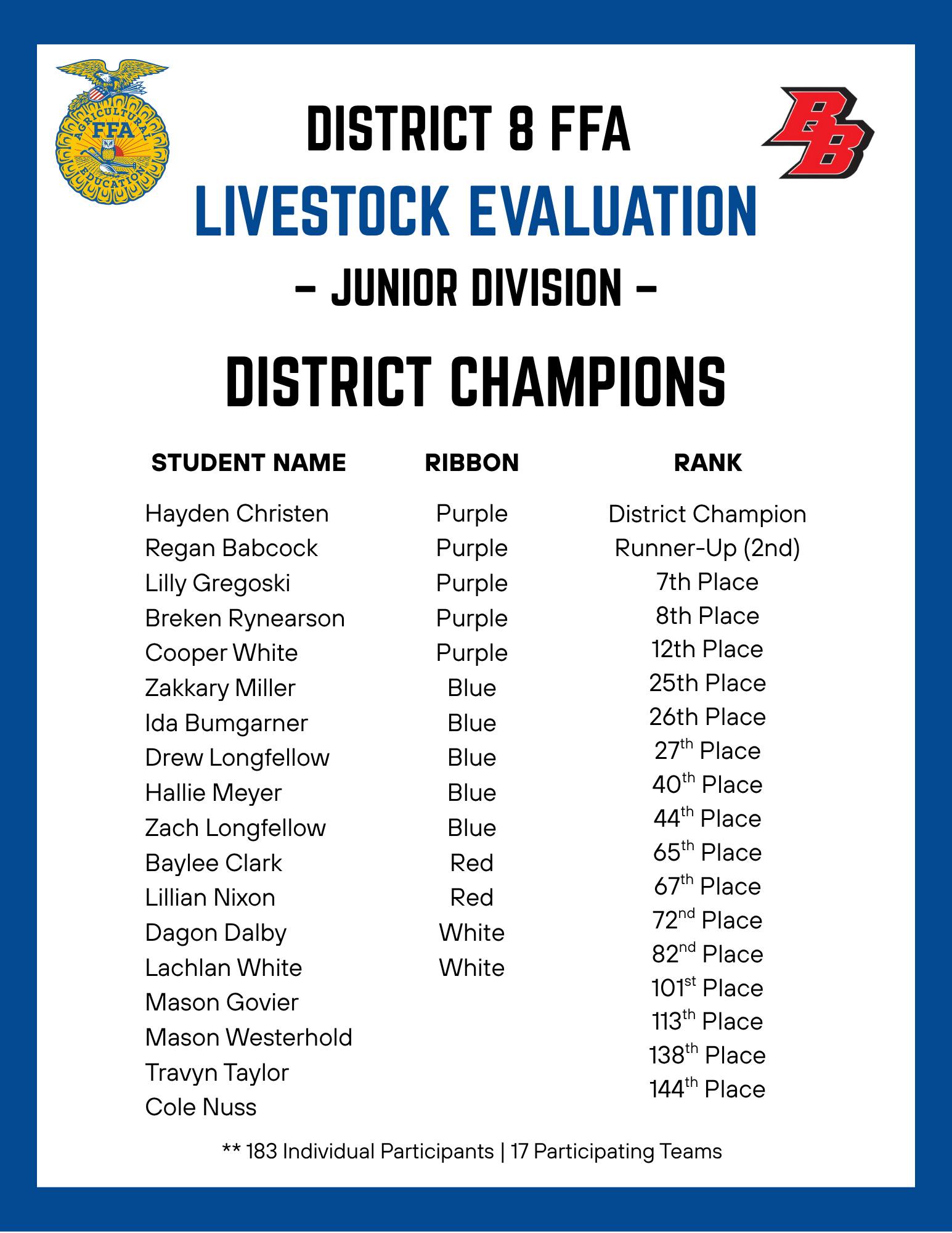 The Junior Division team took the District Championship, with Broken Bow’s Hayden Christen the individual Champion in the Division, and Regan Babcock the Division Runner-up.