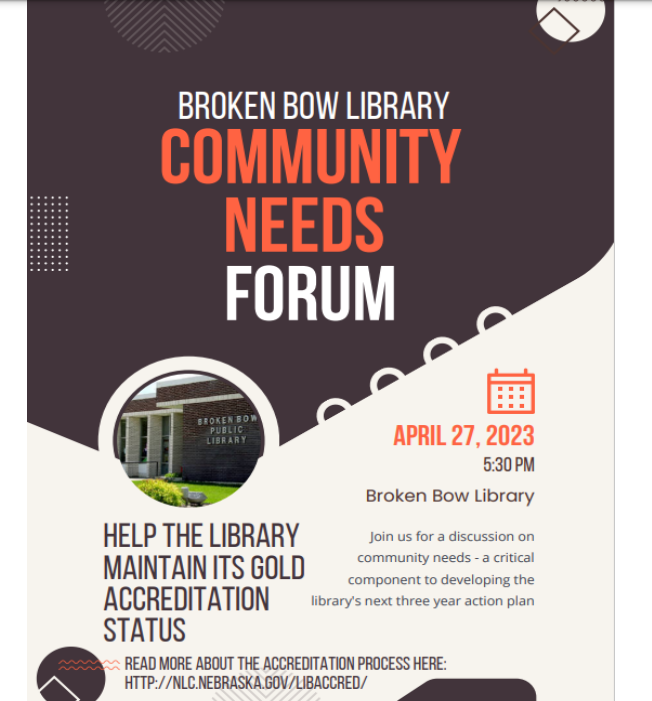 BROKEN BOW – The Broken Bow Public Library will be holding a community needs forum on Thursday, April 27 at 5:30 p.m. The forum will be hosted, naturally, at the library.