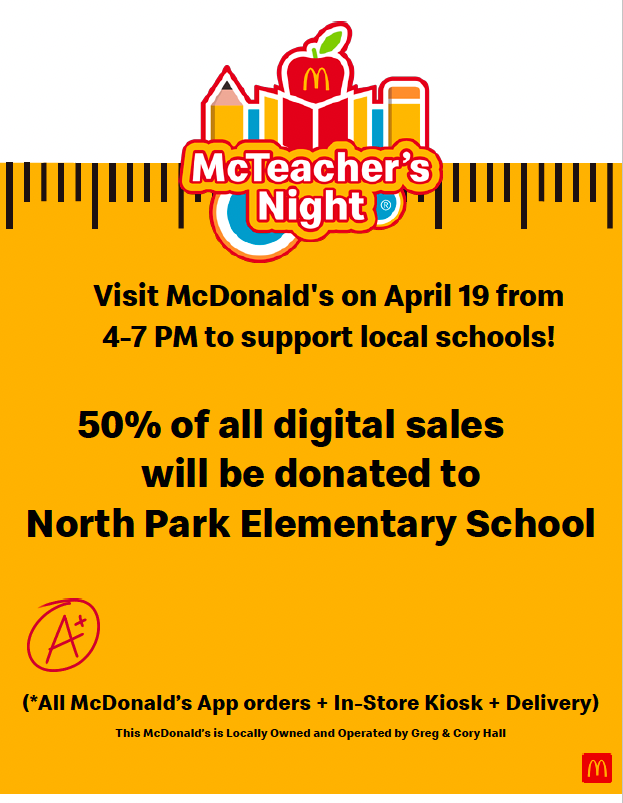 BROKEN BOW – Local McDonald’s owner-operators Cory and Greg Hall are teaming up with North Park Elementary School to host a McTeacher’s Night on Wednesday, April 19 from 4 to 7 p.m.