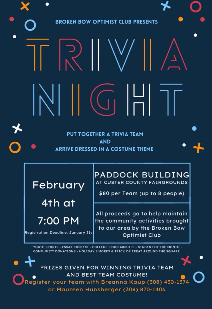 All proceeds from the trivia night will help maintain the community activities sponsored by the Broken Bow Optimist Club.