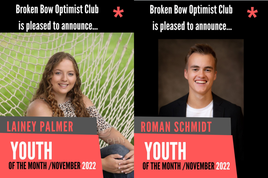 BROKEN BOW – The Broken Bow Optimist Club has announced their Youth of the Month for the past month: Lainey Palmer and Roman Schmidt are the Broken Bow seniors nominated for their outstanding leadership and optimism.