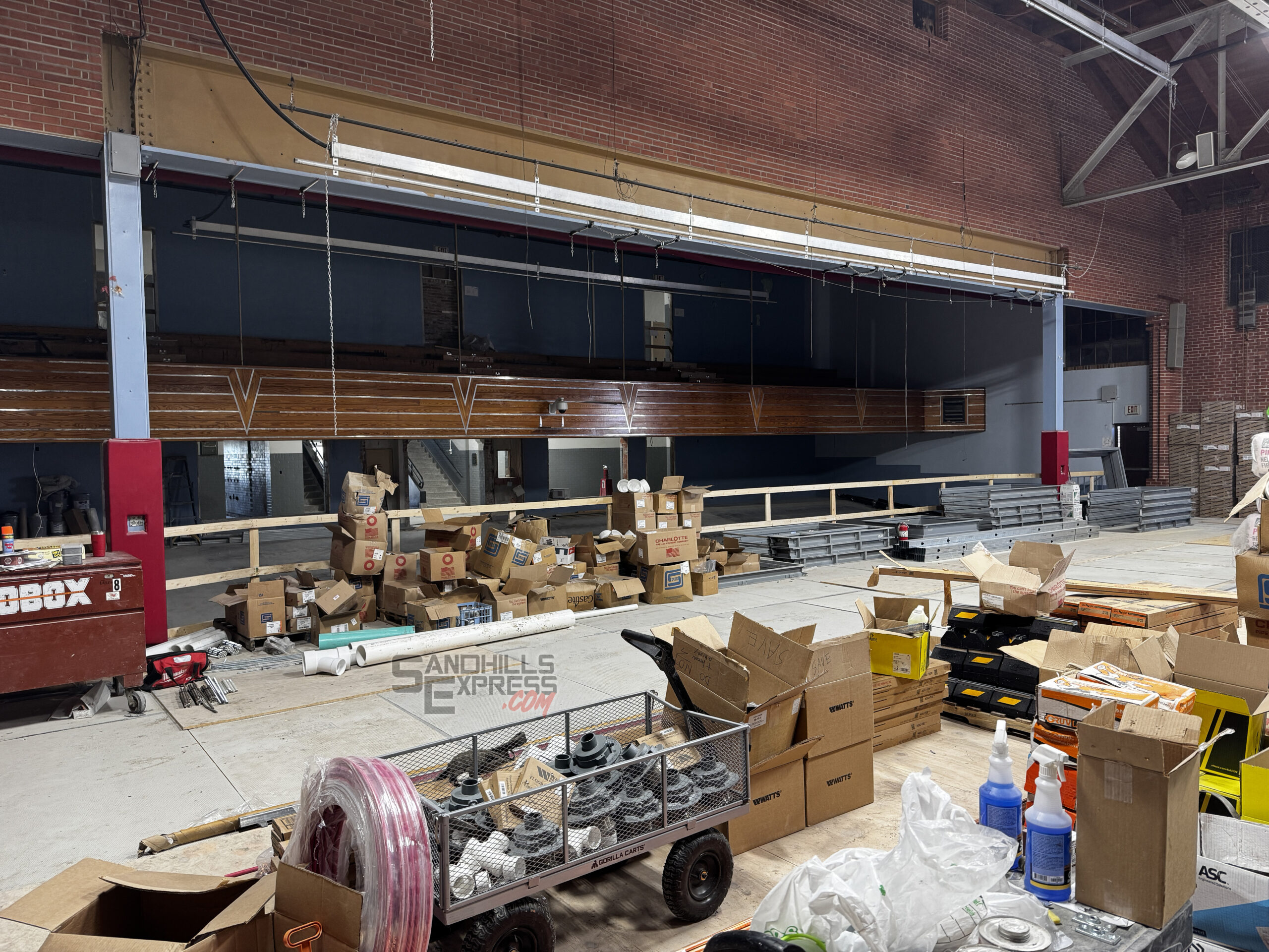 The locker rooms off of the middle school auditorium have been removed and replaced with a hallway to give locker room access without possibly disturbing an event on the stage. A prop staging area also sits at the back part of the stage area. Double doors have been replaced by a large garage door for moving large props on and off of the stage.