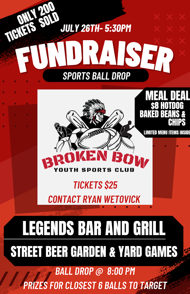 The fundraiser will take place in downtown Broken Bow around Legends Bar and Grill.  The event will start at 5:30 and feature a street beer garden and yard games for kids and families.  A meal deal of a hot dog, baked beans, and chips will be available for a cost of $8.  The fundraiser will also include a ball drop to take place around 8 p.m.  Tickets for the ball drop are $25 each with prizes awarded to the six closest to the bullseye.  A maximum of 200 tickets will be sold and can be purchased by contacting any board member (Ryan Wetovick, Jason Rynearson, Jeff Denson, Skylar Morris, Breanna Kaup, or Ashley Peters), at RT Ace Hardware or Legends Bar and Grill in Broken Bow.