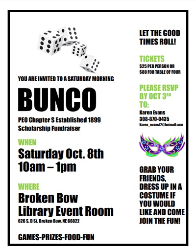 BROKEN BOW–Let the good times roll! A Saturday morning BUNCO event is scheduled for October 8 from 10 a.m. to 1 p.m. at the Broken Bow Library (626 S. D Street).