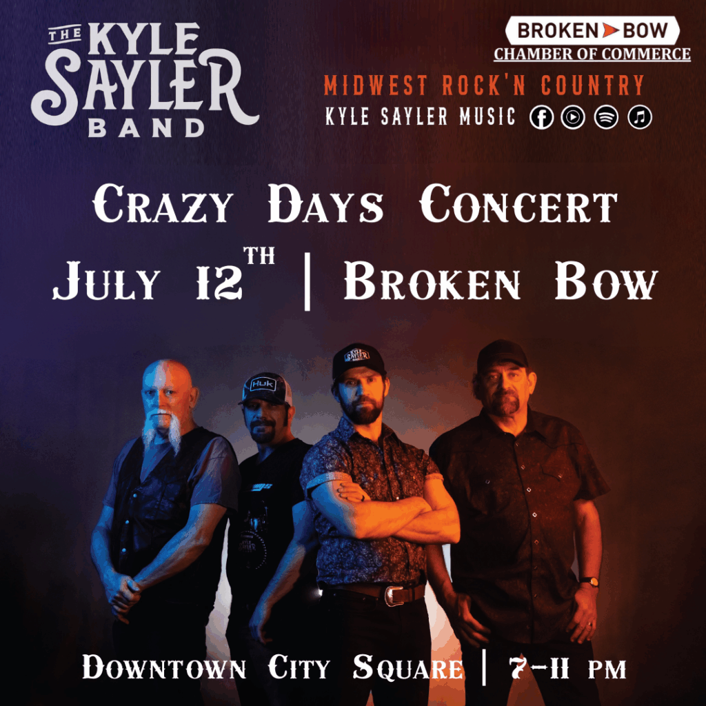 The Broken Bow Chamber is also bringing a good time fueled by The Kyle Sayler Band on Saturday night from 7 to 11 PM. The north side of the square will be host to their brand of music branded as “Midwest Rock’n Country”.