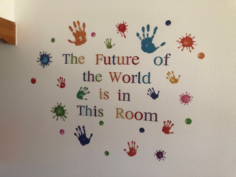 A tour of the home starts right at the front door with a wall-mounted iPad that provides check in and check out ease and security. To the left and right are two different playrooms. The back hallway houses a changing room, a bathroom, and nap rooms for infants as well as the older children complete with wall mounted cameras to ensure much needed rest is happening. A large kitchen and a single toilet just inside the back door from the playground equipment almost give the feeling that the home was built exactly for this purpose.