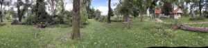 Trees have fallen everywhere; the park’s green grass is now more leaves and limbs than shoots and tufts. Whole root systems have been rotated 90 degrees, leaving enormous craters and wet dirt. Miraculously, nothing fell on the historic first courthouse in the center of the park.