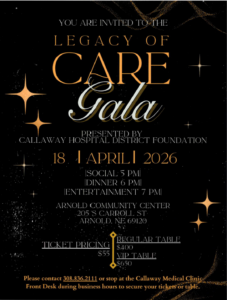 For more information about the Arnold Clinic project or the Legacy of Care Gala, contact the Callaway Hospital District Foundation at Callaway District Hospital, 211 E Kimball Street, Callaway, NE 68825, or call 308-836-2111.