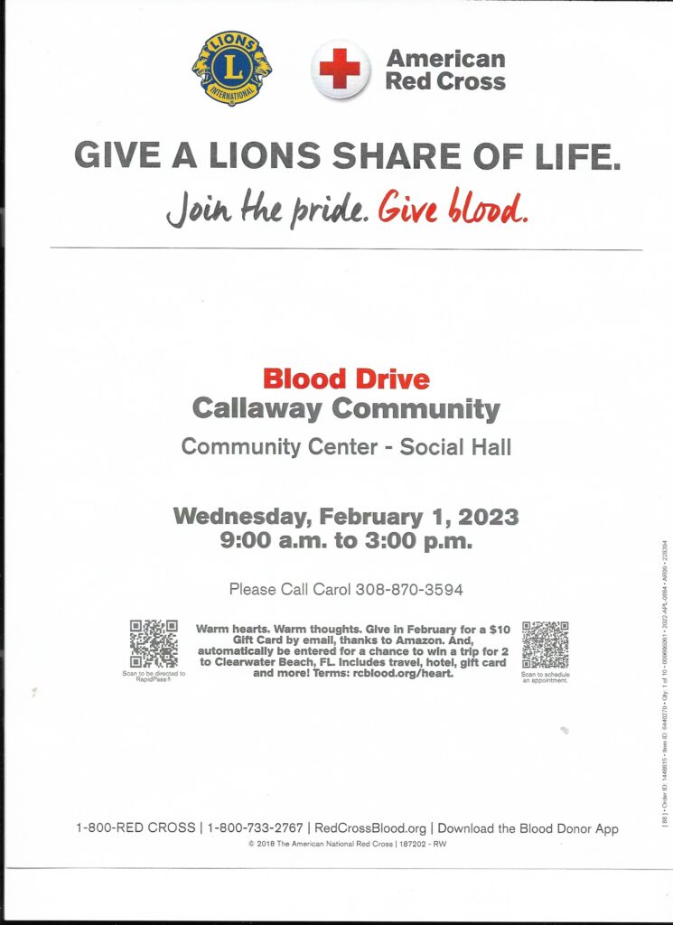 CALLAWAY – A blood drive will be held in Callaway at the Community Center on February 1 from 9 a.m. to 3 p.m.