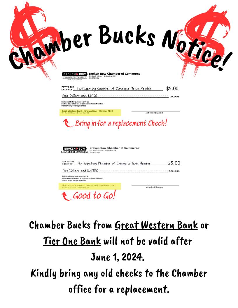 BROKEN BOW-Chamber Bucks with the incorrect bank on them will become invalid after June 1, 2024. Any Chamber Bucks that say Great Western Bank or Tier One Bank can not be used after June 1st, but can be replaced with valid Chamber Bucks of the same value.